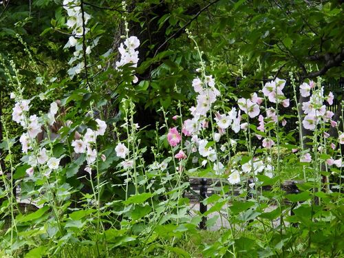 大きな木は木陰を作ってくれる なんと31.1℃までいったんだそうだ。幸い多少風が吹くのでそれでもまだしのぎやすいが、家中の窓を開けた。 タチアオイが何色も花を咲かせている。写真にしていたらおばさんが「随分近づいて撮るのねえ」と。最近のカメラは様々…
